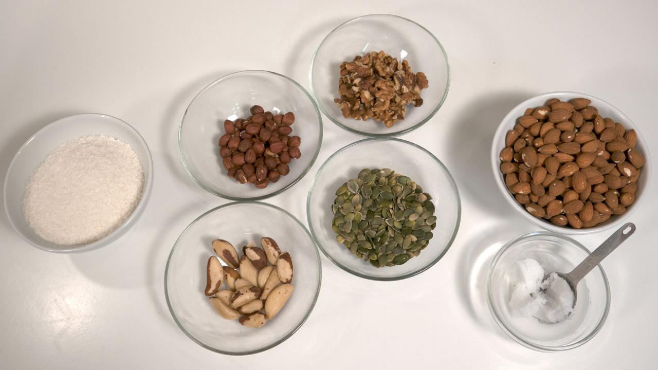 Slice/cut all the nuts and grains to a thickness that you would be comfortable eating at your breakfast or with fruit and/or yogurt.