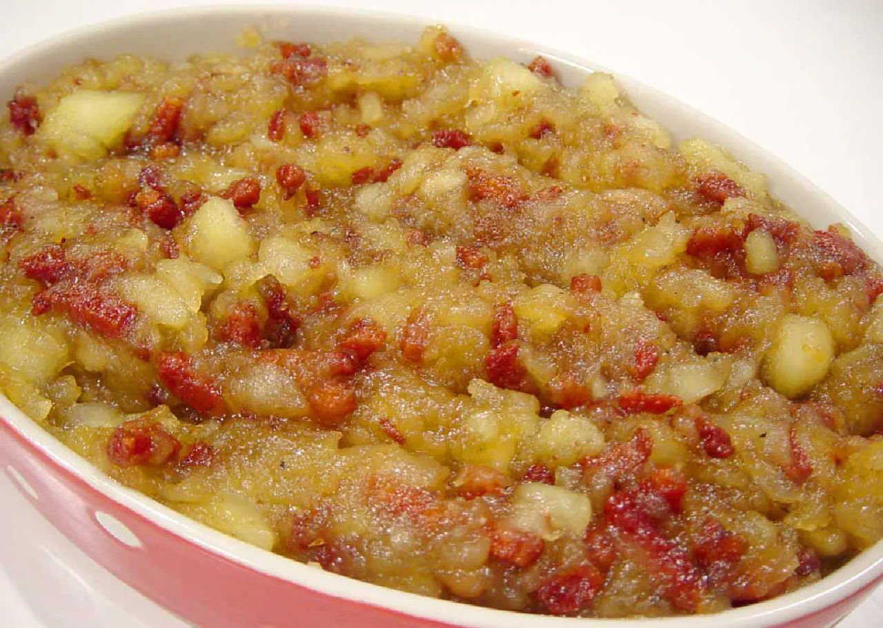 The dish is not very sensitive to the amounts of each ingredient. So the loose recipe is: “a pan full of peeled apples, enough bacon to cover the bottom of the pan, and enough sugar to cover the apples.”