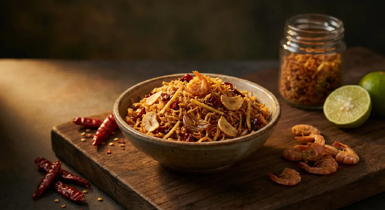 A Burmese crispy fried condiment made from dried shrimp, garlic, onions, and chilli. Each component is fried separately until completely dry and crunchy, then combined. It keeps for months at room temperature and is a staple of Burmese home cooking – mixed into rice, scattered over noodles and vegetables, or eaten as a side with any meal.