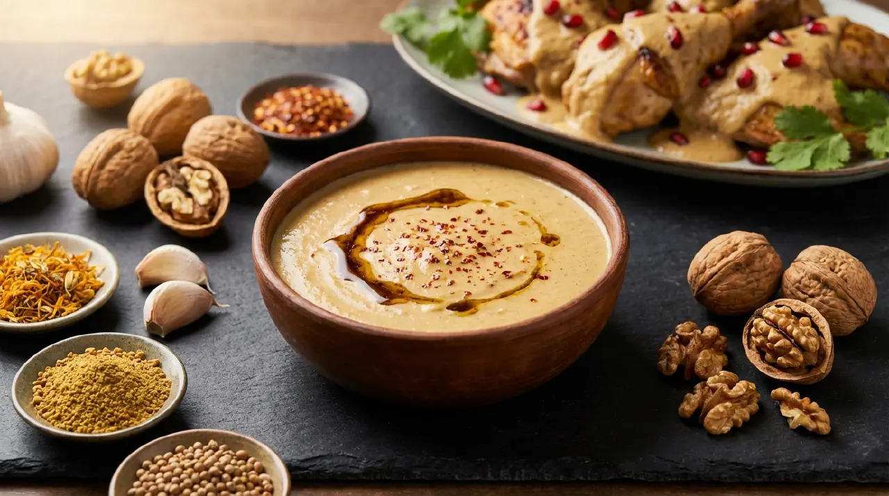 Bazhe is a cold walnut sauce from Georgia, served with poultry, fish, or vegetables. It is made from raw walnuts ground to a fine paste, thinned with water, and seasoned with the classic Georgian spice combination of blue fenugreek, dried marigold, coriander, and chili. The consistency should fall somewhere between thick sour cream and gravy. It is always served at room temperature or chilled.