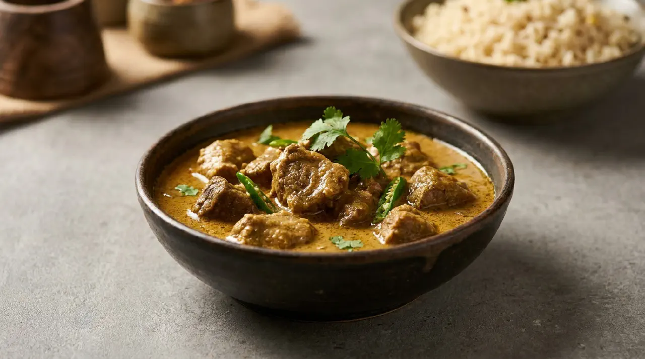 The meat is briefly marinated in milk and dry spices — chilli, coriander, turmeric, cumin, pepper — before being browned with onions, garlic, and ginger. The marinade is then added and the pot simmers covered for one and a half to two hours. The milk separates at first but comes back together into a smooth sauce as it cooks down. Garam masala goes in at the end to preserve the aroma of the spices.