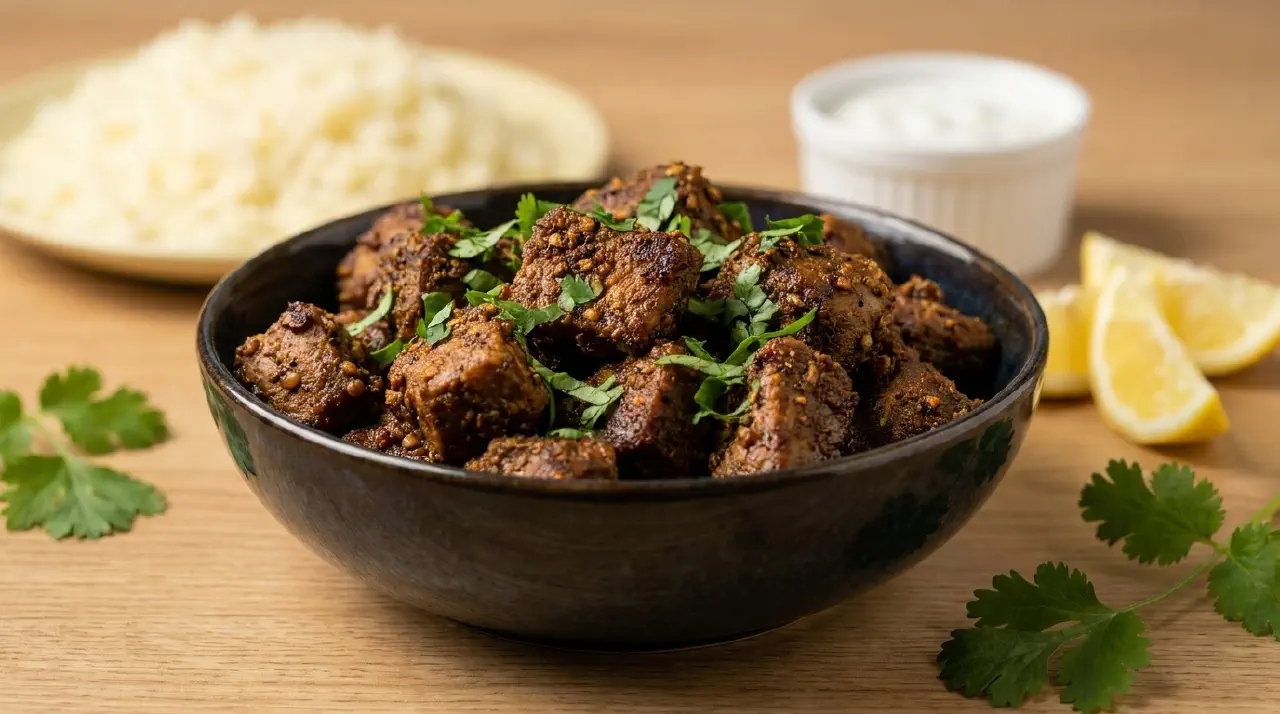 Bhuna ghosht is a dry-fried spiced meat dish from northern India. The name simply means fried meat, and the technique relies on cooking the spices and meat over high heat rather than simmering in sauce. The result is concentrated flavour and a dry, spiced crust on the meat.