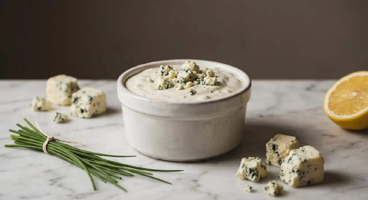 A thick, chunky dressing built on mayonnaise and sour cream with crumbled blue cheese folded in. It originated in the US, probably in the 1950s or 60s alongside the rise of buffalo wings. The hallmark of a proper blue cheese dressing is the texture - some cheese mashed into the base for body, the rest left in visible chunks. Use less buttermilk for a thick dip (wings, vegetables) and more for a pourable salad dressing.