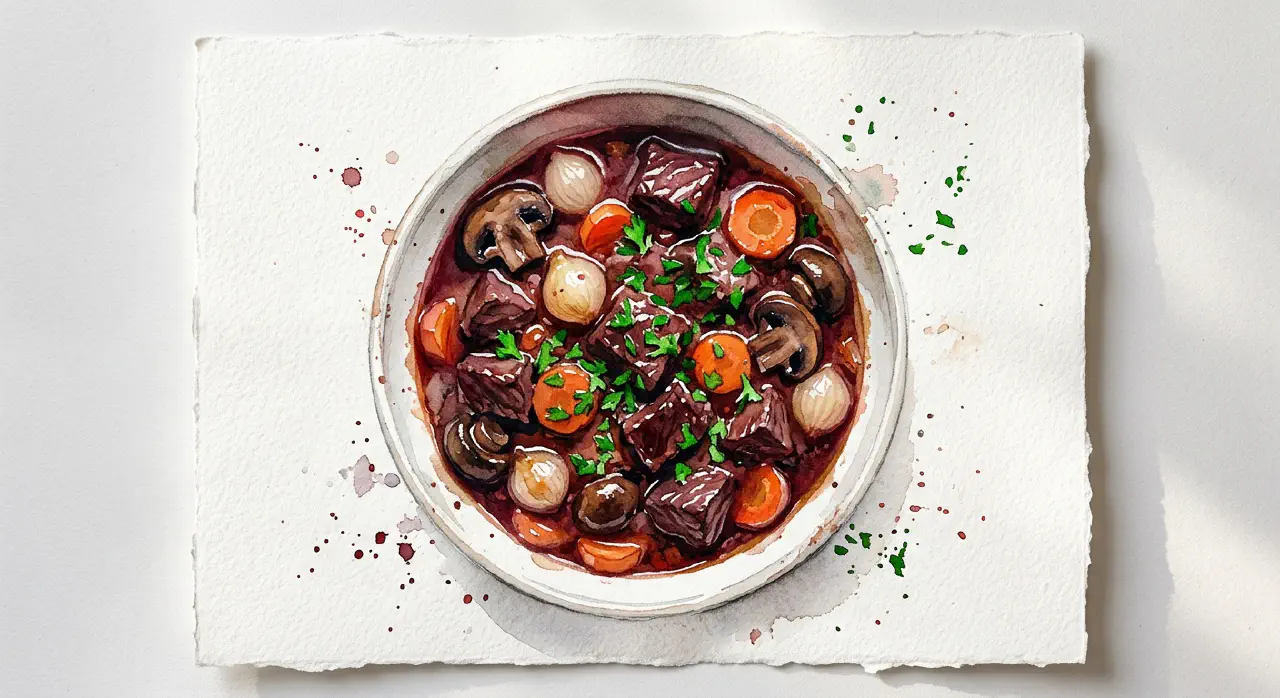 Boeuf Bourguignon is a Burgundian beef stew with red wine, shallots, carrots and mushrooms. It is not difficult, but it takes time — the meat must be browned thoroughly in several batches, and the dish needs to simmer for at least 1½ hours before the mushrooms are added at the end. A strip of orange peel in the pot is not accidental: it lifts the heavy wine sauce.