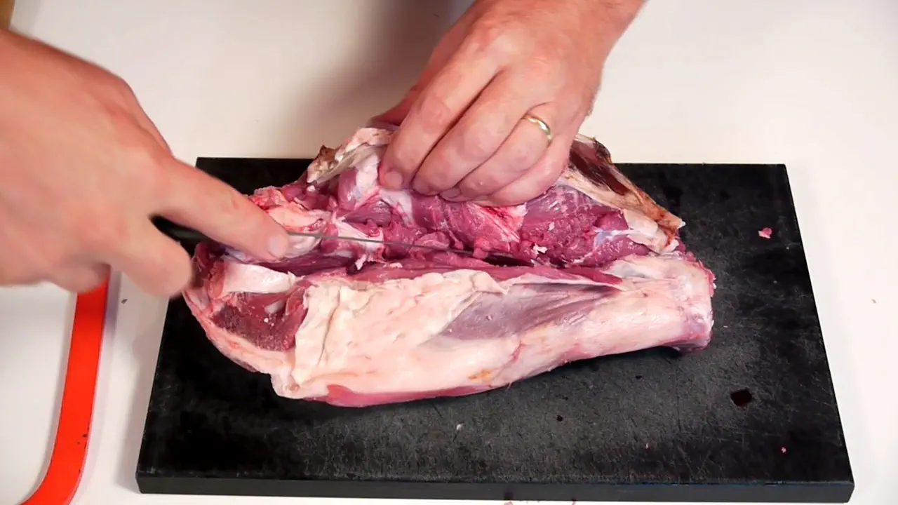 Then you should find the bone on the inner side of the leg. That is where it sits closest to the surface. Cut into the meat along the bone, until you hit the bone.