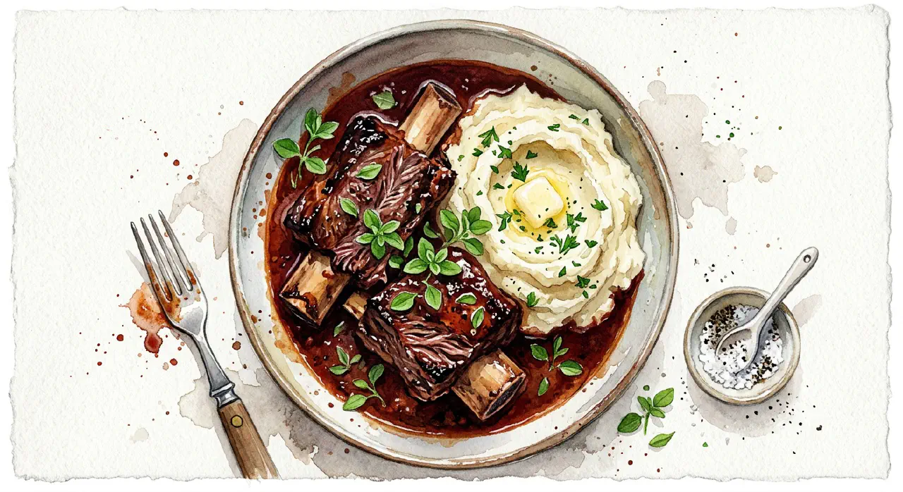 Braised short ribs slowly cooked in tomato sauce until the meat falls off the bone. Short ribs are a fatty, collagen-rich cut that benefits from time — 3–4 hours over gentle heat gives a thick, dark sauce and meat that practically melts. Marjoram is the herb that gives this dish its character. Serve with mashed potato.