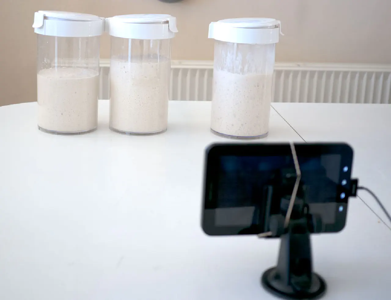 Setup from the left: 6 g, 12 g, and 25 g of yeast - 80% hydration.