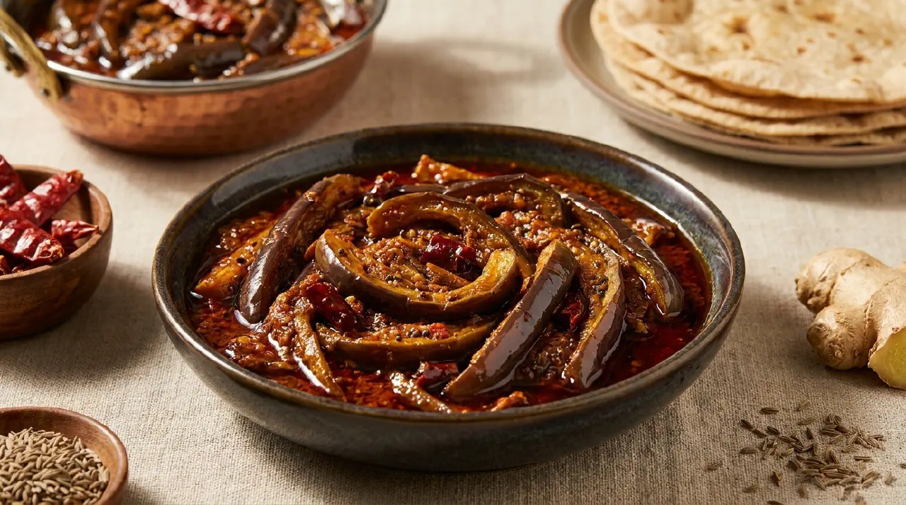 Brinjal pickles are a South Indian aubergine pickle cooked with tamarind, chilli, mustard seeds, ginger, and vinegar. The dish comes from southern India, where pickles (achar) are a standard companion to rice and curry. They are eaten in small amounts – a couple of spoonfuls on the plate add acidity, heat, and bite to the rest of the meal.