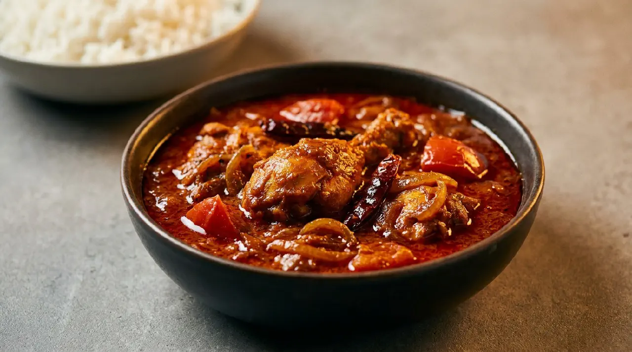 Vindaloo comes from Goa on India’s west coast, where the Portuguese left their mark with wine and garlic. The Portuguese name “vinha d’alhos” became vindaloo, and vinegar took the place of wine as the dish moved into Indian kitchens. The result is a dark, sour, and fiercely hot stew that stands far from the milder Indian dishes.