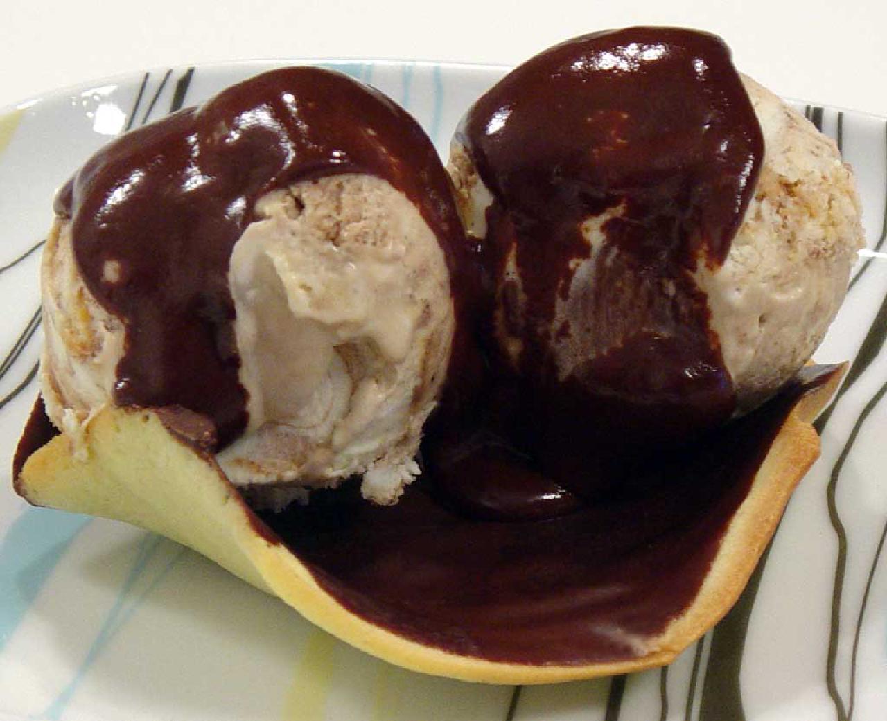 Hot chocolate sauce on cold cold ice. © kvalifood.com