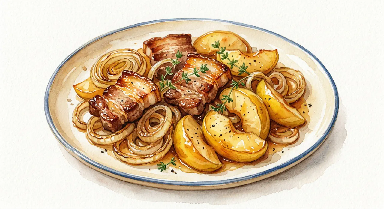 Classic æbleflæsk — fried pork belly with apples and onions, arranged side by side on a warm plate. Served with dark rye bread and mustard. Simple, solid everyday food.
