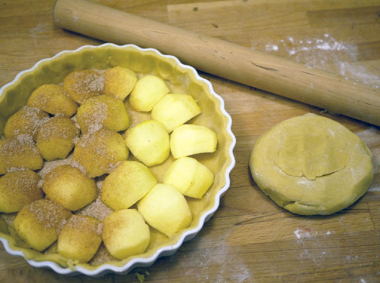 The bottom is made, and half of the apples are sprinkled with cinnamon sugar.