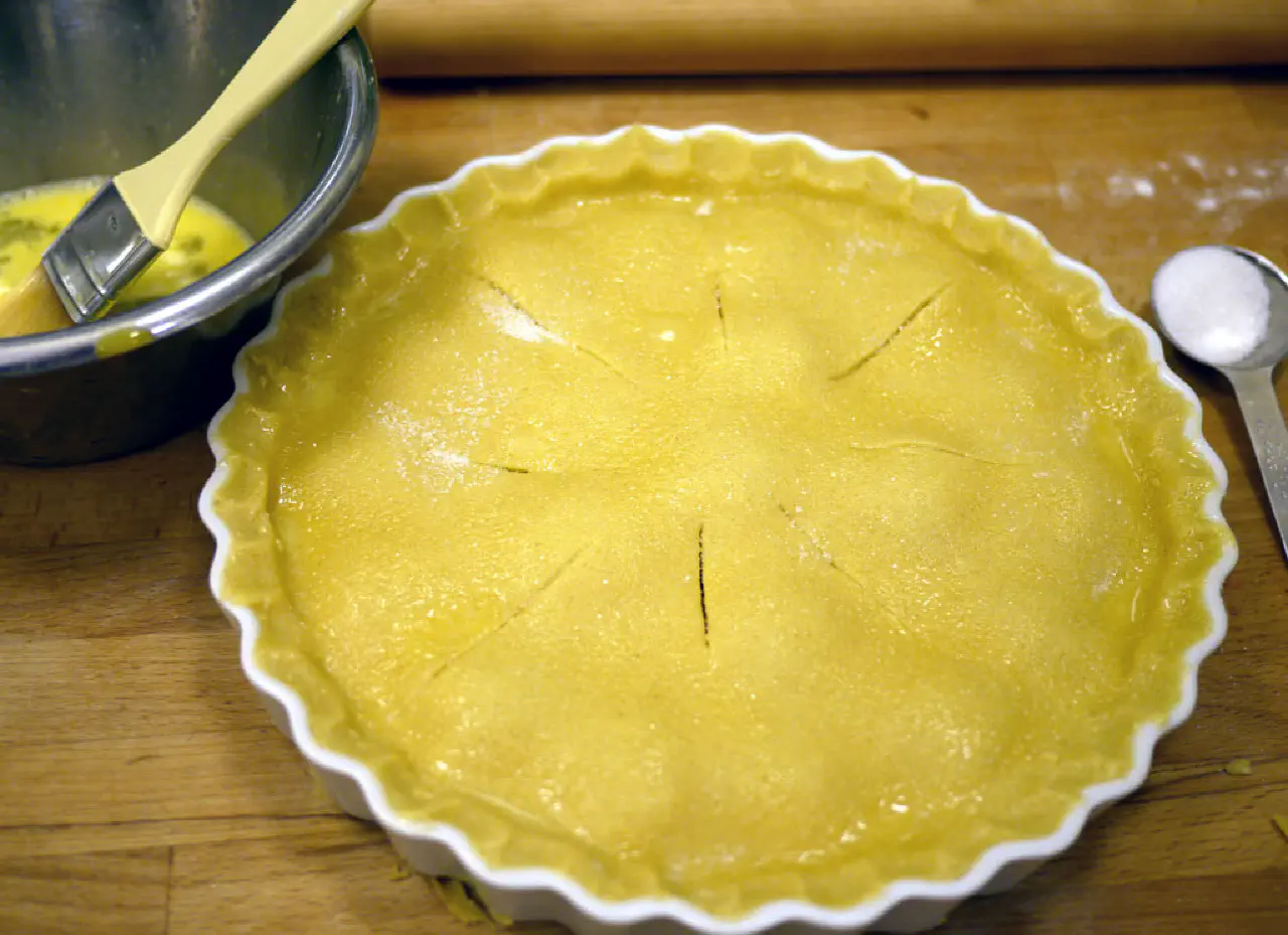 Put on a lid of shortcrust of pastry, and cut some slices in it, so that the steam from the apples can escape. It will prevent the dough from getting wet.