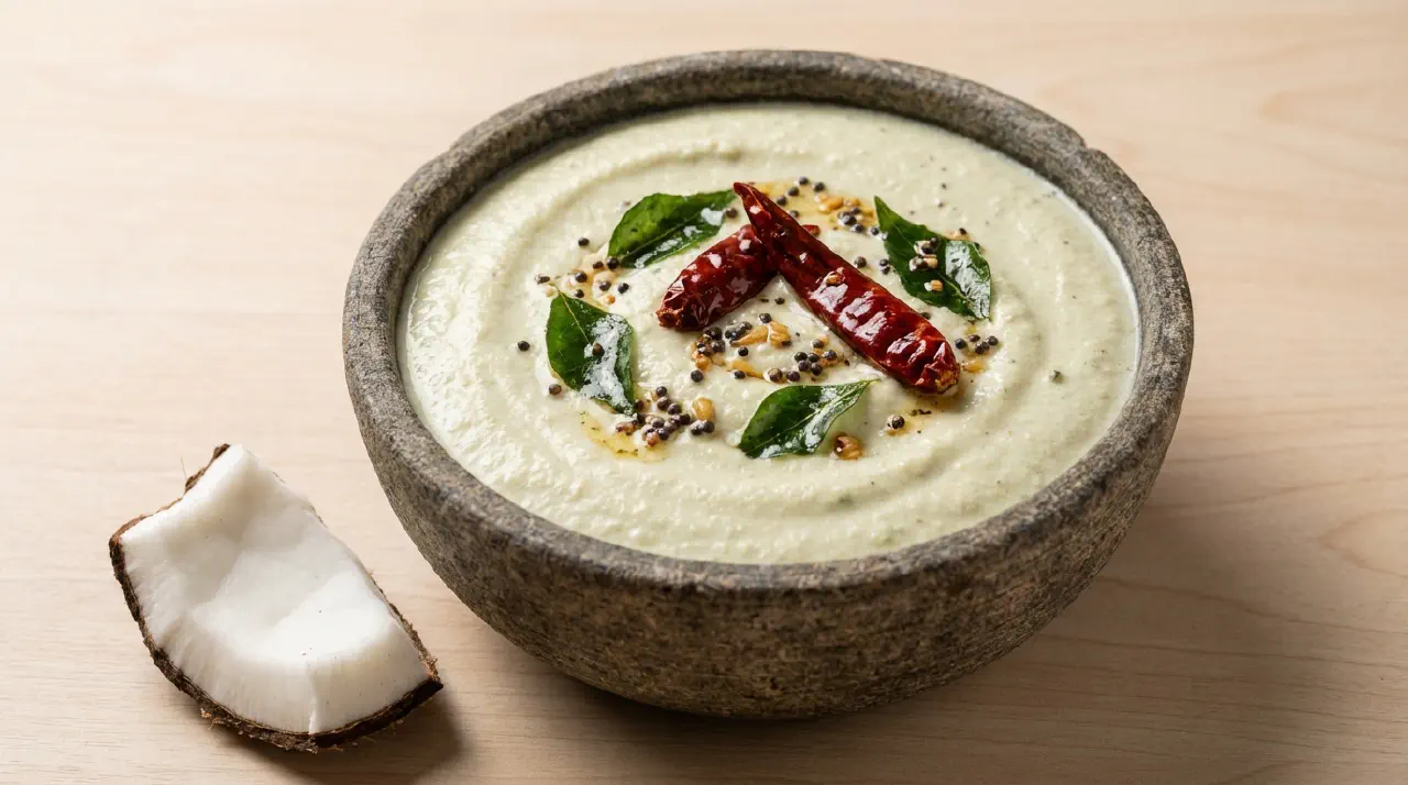 A South Indian coconut chutney ground from fresh coconut with roasted chana dal, green chilies, and ginger, then finished with a mustard seed tempering. It is the standard accompaniment for the South Indian breakfast trio of idli, dosa, and vada.