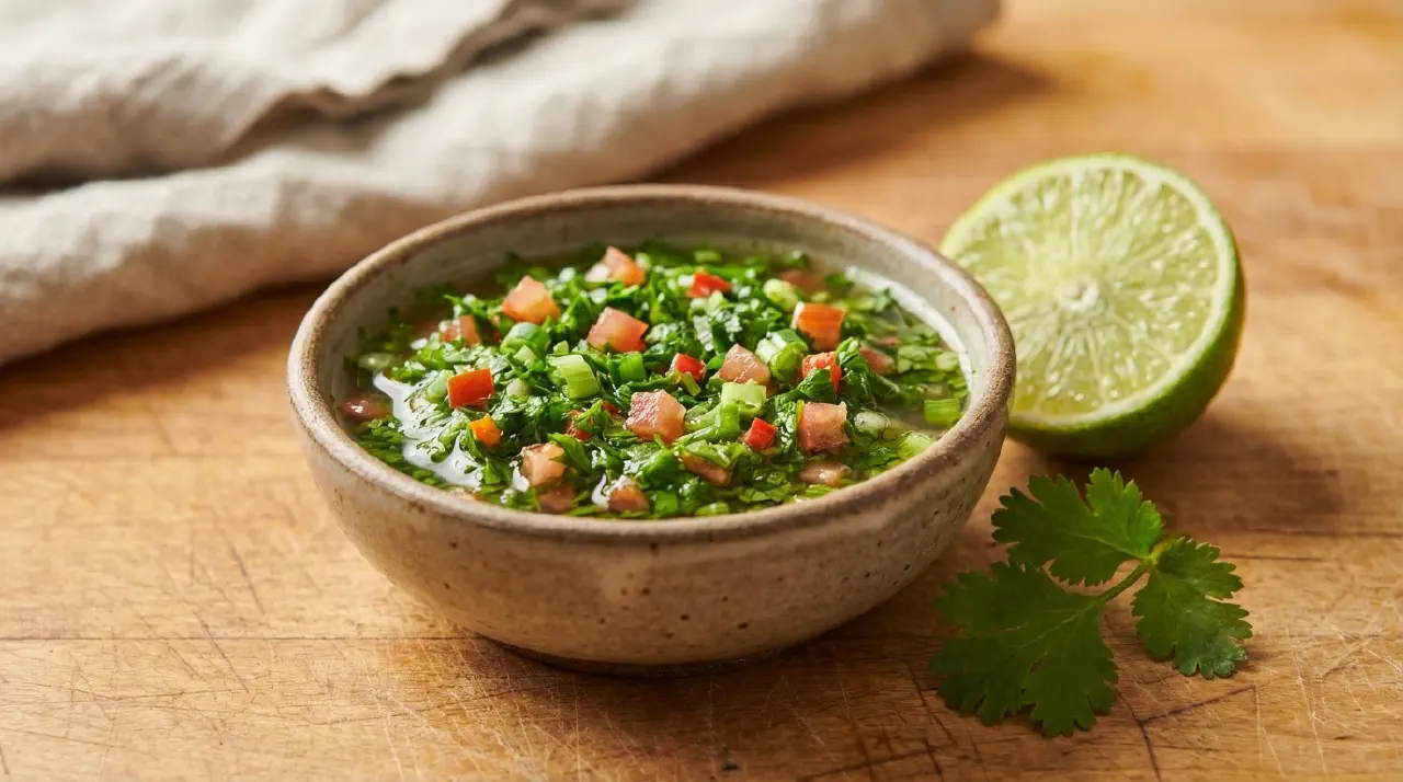 Colombian aji picante is a fresh, vinegar-based hot pepper table sauce. Hand-mincing the ingredients is more traditional than blending, giving a chunky texture with distinct pieces of tomato, scallion, and cilantro.