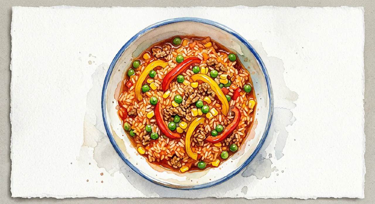 Colorful everyday pot is an easy one-pot dish with ground pork, rice, and vegetables cooked in tomato sauce. Everything is made in the same pot — the rice absorbs the sauce and becomes full of flavor. Bell pepper, peas, and corn are added at the end to keep their color and bite. Serve straight from the pot.
