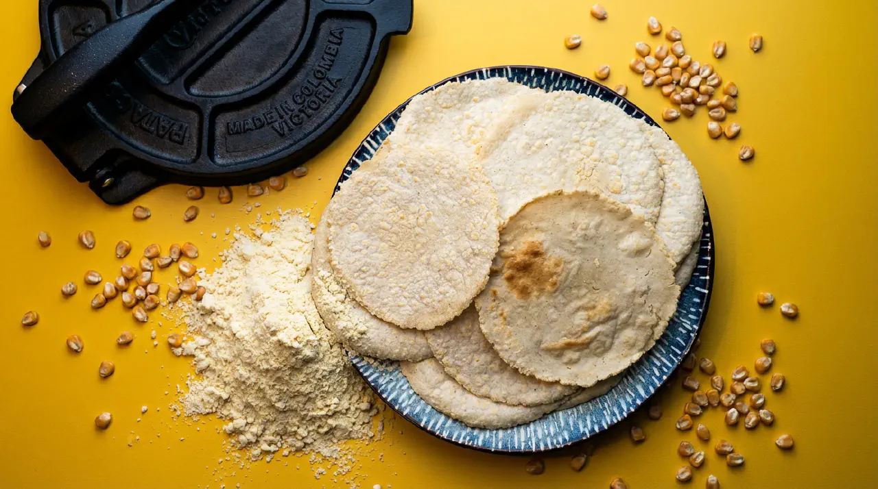 Homemade corn tortillas require only three ingredients: masa harina (nixtamalised corn flour), water, and salt. The dough comes together in minutes, and the tortillas are cooked on a dry, hot pan without any oil. The most important sign of success is the tortilla puffing up during the third flip - this means the two dough layers are separating like a pitta, giving the right soft texture.