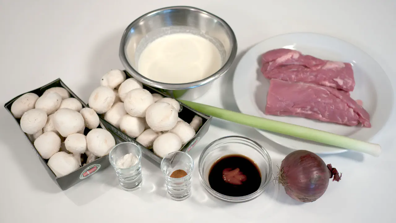 Ingredients for pork tenderloin with cream and mushroom sauce © kvalifood.com
