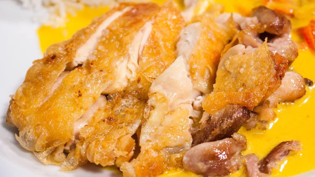 The principle of making crispy chicken thighs is that it must be boiled first, after which the skin must be as dry as possible before you fry it. Then it should be cooked in plenty of fat at a fairly high temperature.