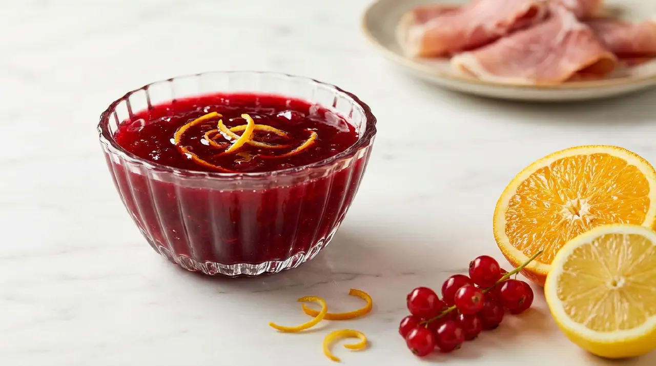 A classic British cold sauce of redcurrant jelly, port, and citrus. It dates back to at least the 1850s and appears in both Soyer’s and Escoffier’s cookbooks. Traditionally served with cold ham, game, terrines, and pork pies.