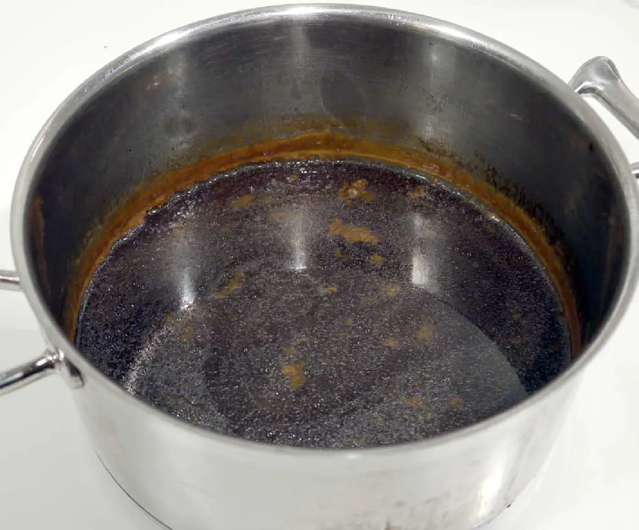 The 2 liter (2 quarts) stock in this recipe should be further boiled until it is reduced to between ½ and 1/3 the amount. You have to do it by taste to see if it is of sauce strength.