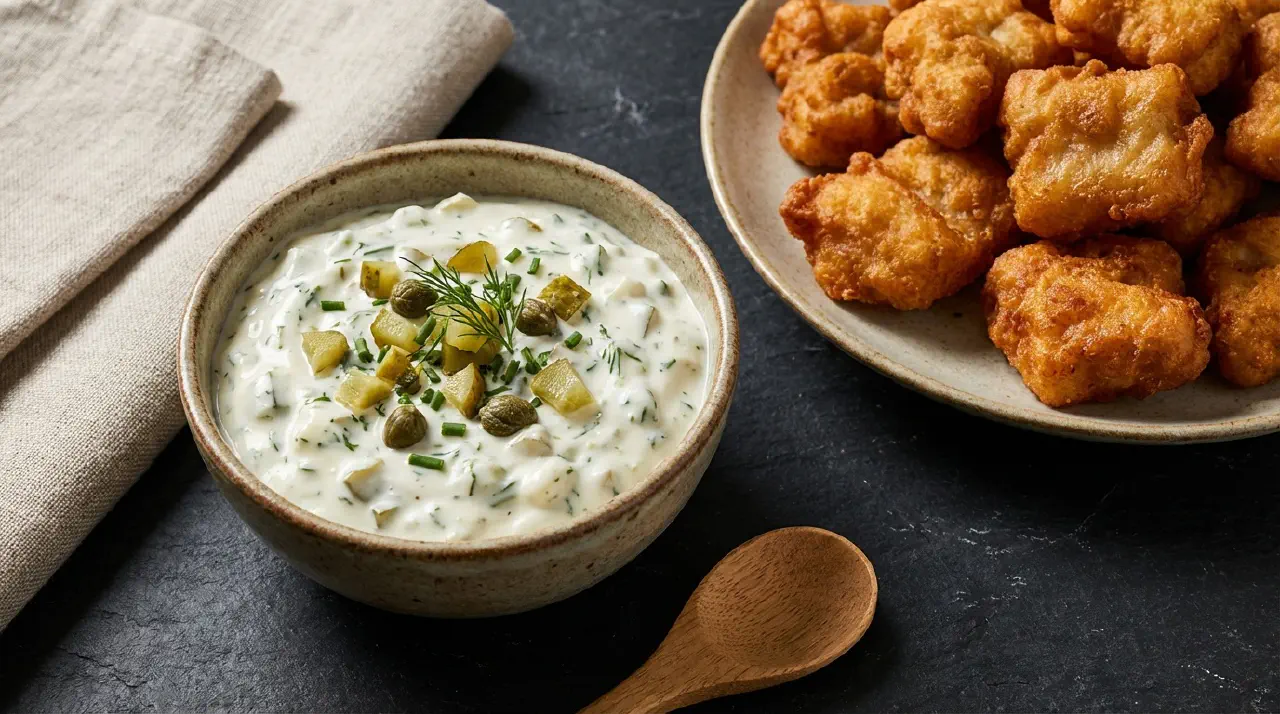 Dutch ravigotesaus is a cold mayonnaise-based sauce with pickles, capers, shallot, mustard, and fresh herbs. It is the standard accompaniment to kibbeling (fried cod bites) and other fried fish in the Netherlands. The name comes from the French word ravigoter, meaning to invigorate.