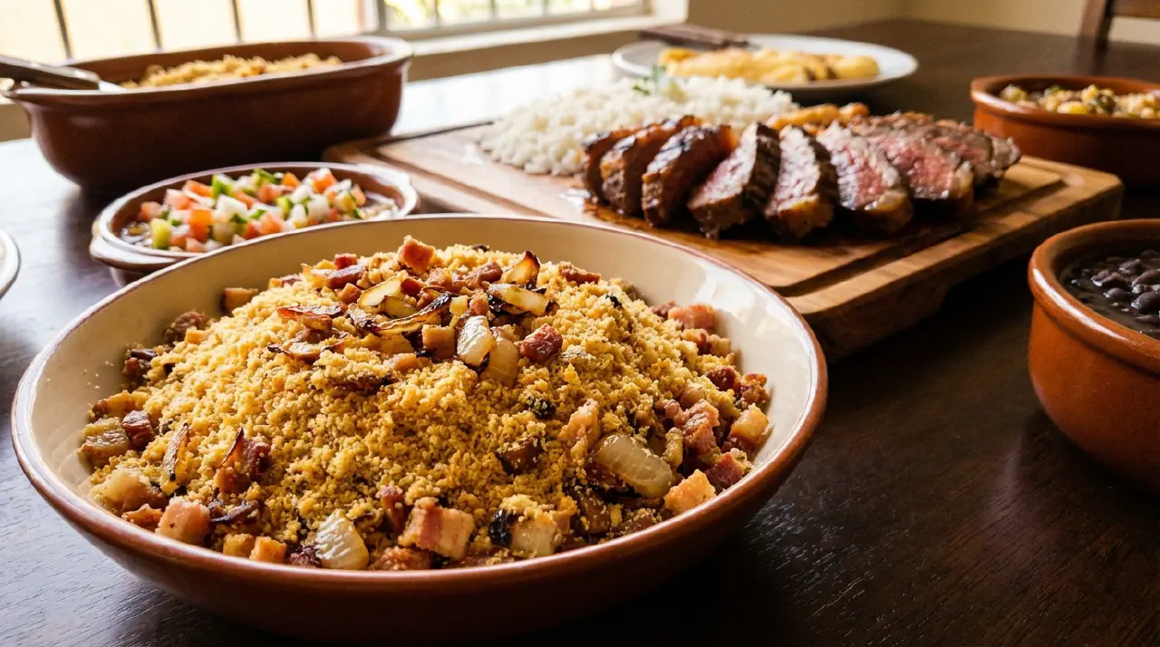 Farofa is a Brazilian side dish of toasted cassava flour (farinha de mandioca) cooked in rendered bacon fat and butter with onion and garlic. The flour toasts quickly into crunchy, savory crumbs that are spooned over rice, beans, grilled meat, or feijoada. The whole thing takes under 10 minutes.