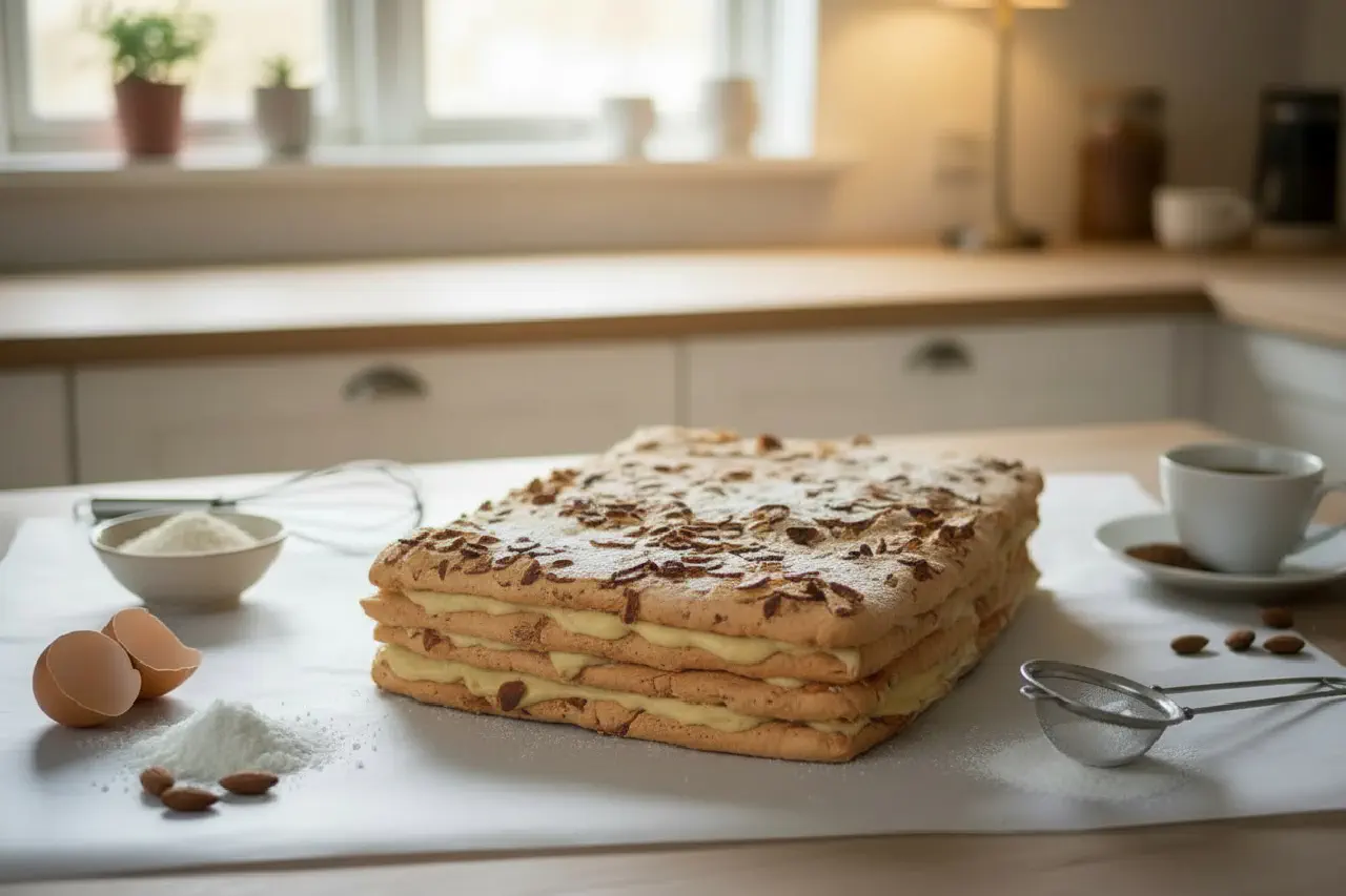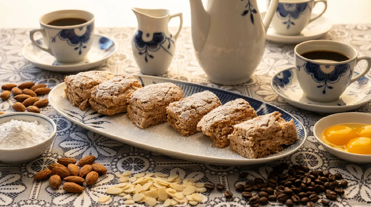 Fragilité is a classic Danish pastry cake invented around 1910 by the Copenhagen pâtissier Johannes Steen - the same man behind the Sarah Bernhardt cake. Despite its French name, it is a Danish invention, strongly influenced by the French pâtisserie tradition that dominated Danish confectionery at the beginning of the 20th century. The cake consists of crisp, airy almond meringue layers and a silky smooth mocha buttercream, cut into small, elegant pieces. Variations with nougat, raspberry, or pistachio exist, but the mocha buttercream is the classic and most widespread version.