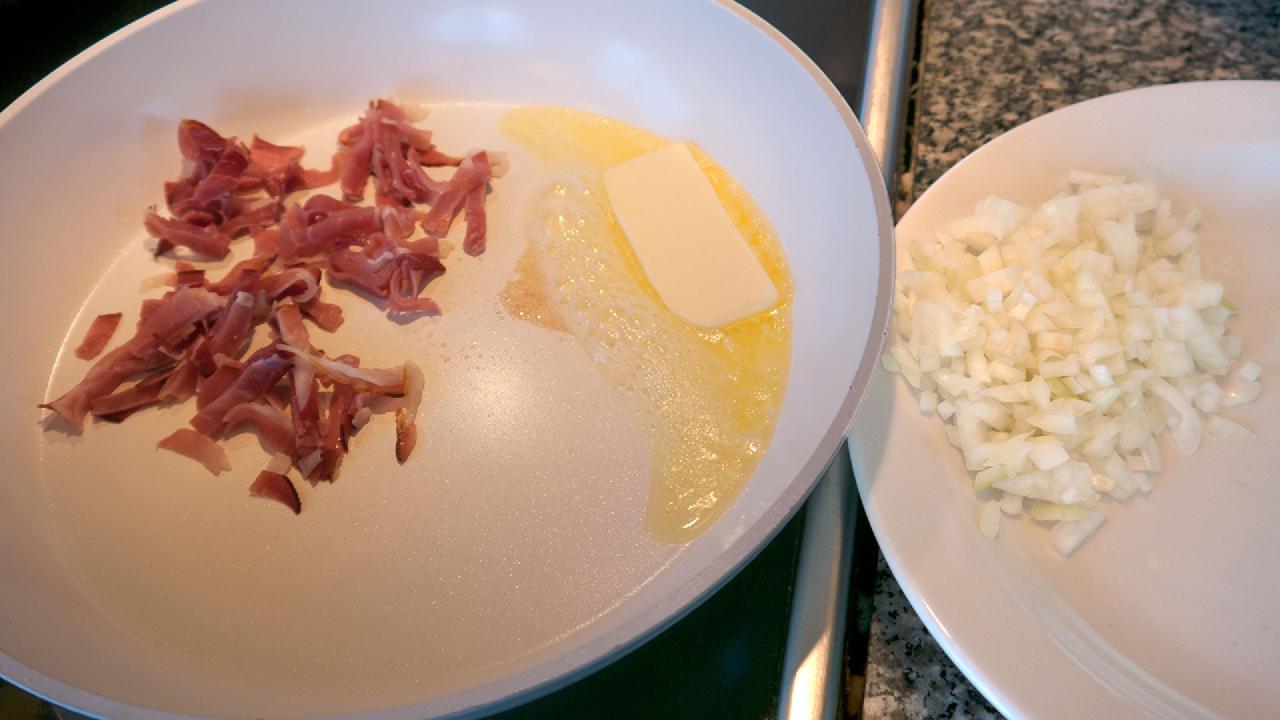 If you use dried bacon or Black Forest ham, as I do in the pictures, you only need 100 grams. Dried pork has a stronger taste and contain only a little water. And you need 50 grams of butter, like I use in the pictures.