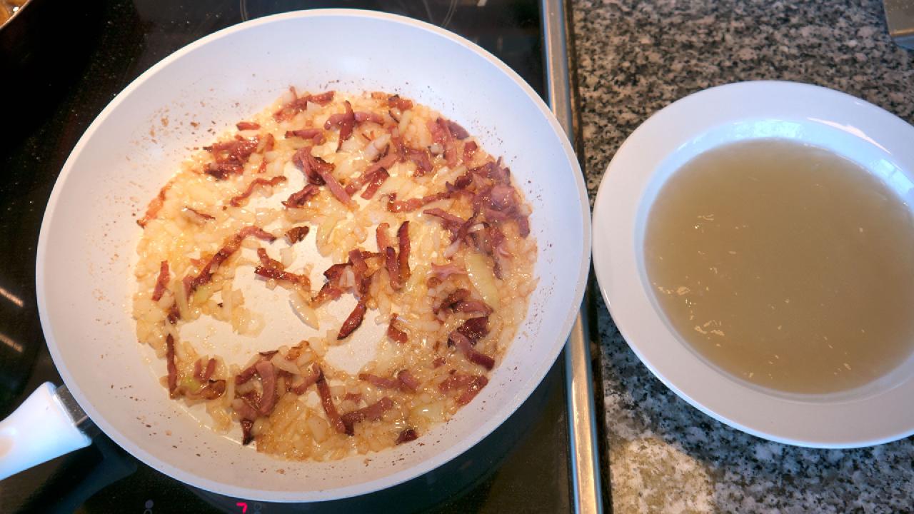 When the bacon begins to crisp, add the onions and fry them until they are translucent.