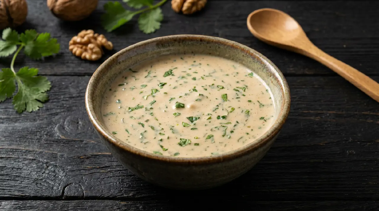 Garo is a Georgian walnut sauce made with chicken stock, lemon juice, and fresh cilantro. It belongs to the family of Georgian walnut sauces alongside bazhe and satsivi, but stands apart because the sauce is simmered with stock rather than served raw. It pairs with roasted or grilled chicken and fried fish.