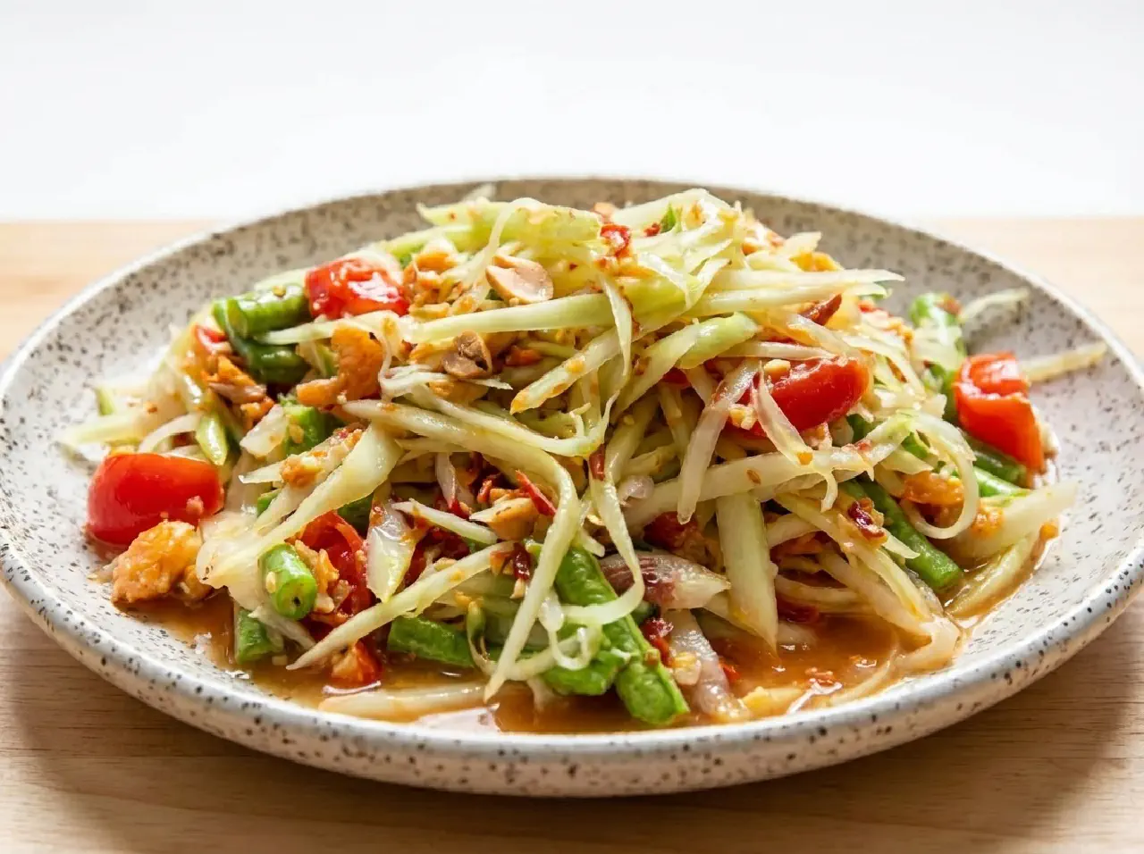 Thailand’s most famous salad, from the Northeastern Isaan region. “Som” means sour in the Isaan dialect, “tum” means to pound - because the salad is traditionally made by pounding in a large mortar and pestle. The pounding serves multiple purposes: it grinds the garlic and chilies, releases juice from the tomatoes for the dressing, crushes the peanuts, and bruises the long beans so the dressing can penetrate.