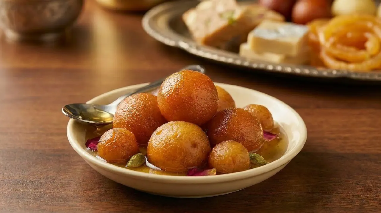Gulab jamun is a North Indian dessert with Mughal-era roots, eaten at Diwali, Eid, weddings, and other celebrations across the subcontinent. The name comes from Persian and Urdu: gulab means rosewater, jamun refers to a dark berry the balls are said to resemble. Homemade fresh cheese is mixed with semolina, shaped into balls, deep-fried, and placed in a spiced sugar syrup. They belong to the same family as rasgulla and kala jamun — small soft balls that soak up syrup and become a mix of crisp and spongy.
