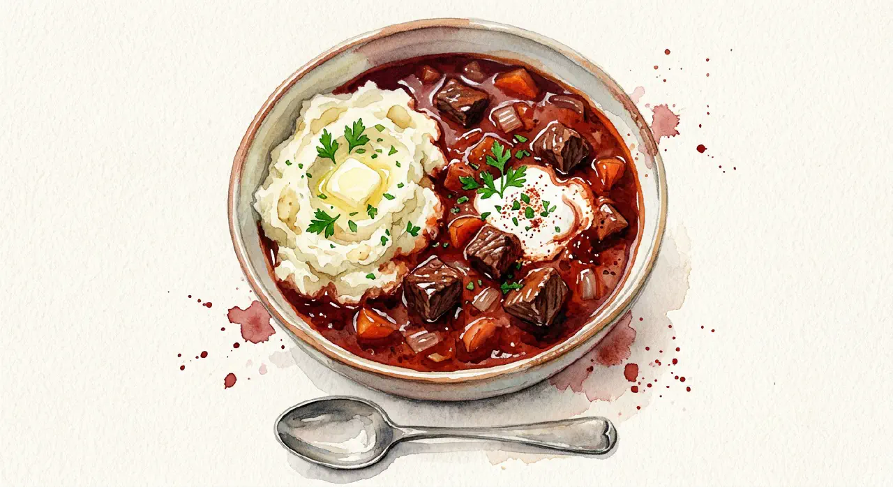 Gulyás is a Hungarian-inspired beef stew that has become a staple of the Danish everyday kitchen. The original Hungarian version is a thin soup; here it is a thick, hearty stew with paprika, onions and tomatoes. The key is plenty of sweet paprika that blooms in the fat before any liquid is added. The flavour improves the day after.