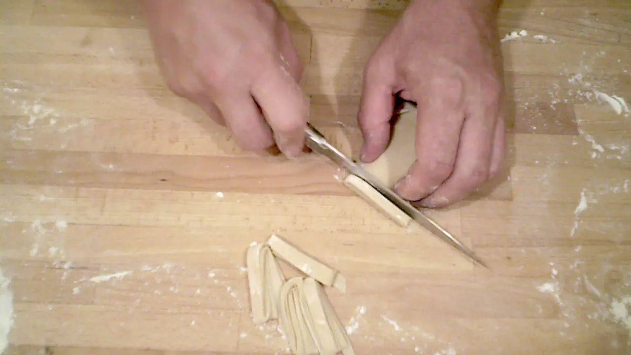 Video Recipe - A lot of us, by now, have a pasta machine, but if you are really hardcore, you make it by hand ;-) A rolling pin and a knife is all you need. The funny thing is that it does actually not take any longer to do it by hand … but it’s quite a bit harder on the arms. Ok. A machine is easier, but it’s fun to do it all by hand.