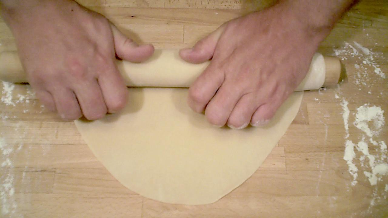 When the dough is so thin that it is difficult to roll it out any flatter then flour the dough and roll around the rolling pin.