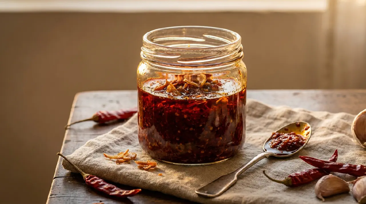 A rich, deeply flavoured chilli sauce from Hoi An in central Vietnam. This is a proper batch recipe - you simmer whole chillies, blend them, then cook the puree with garlic, sugar, and fried shallots in oil until everything comes together into a thick, fragrant sauce. It’s the base for the chilli satay sauce and works on its own as a condiment for just about anything.