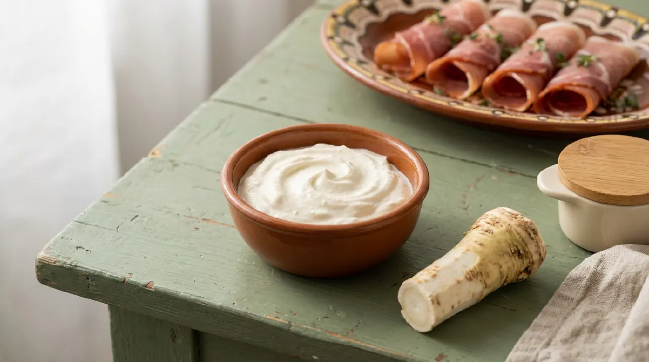 Tormakrem is a rich Hungarian horseradish cream made with a bechamel base and whipped butter. It is thick enough to use as a filling for ham rolls (sonkatekercs) or to pipe into pastry, and is a staple of the Hungarian Easter table.