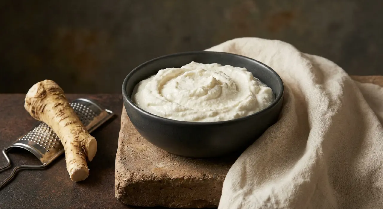 A cold British condiment of whipped cream and freshly grated horseradish. There is no cooking involved – everything is mixed raw. The heat comes from the horseradish root and fades quickly once grated, so prepare this close to serving time. Classic with roast beef.