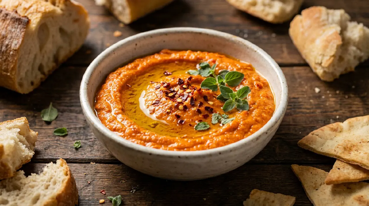 Htipiti is a Greek roasted red pepper and feta dip, served as part of a meze spread with bread or raw vegetables. The peppers are charred and peeled, then blended with crumbled feta, olive oil, and a touch of chili. The texture should be creamy but still slightly rough – not perfectly smooth.