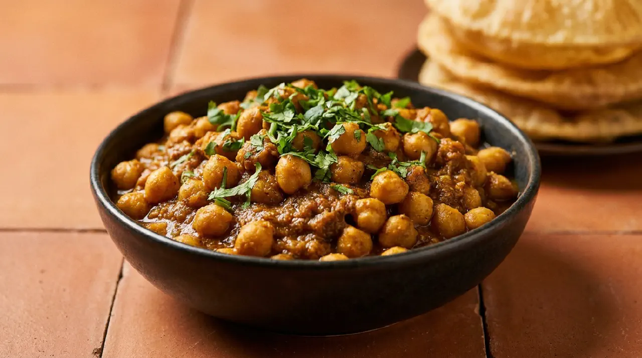 The dish is earthy and warmly spiced, with a thick, savoury sauce that the chickpeas absorb during the simmer. It is filling and relatively mild, with the garam masala finishing the flavour at the end.