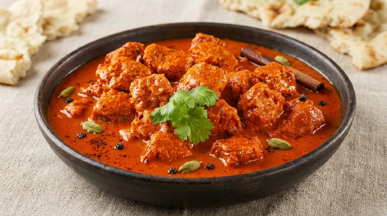 The dish relies on whole spices rather than powder blends. Cardamom and cinnamon provide a gentle sweetness, while ginger and garlic keep the dish in balance. Chilli powder and paprika give colour and mild warmth, not sharpness.