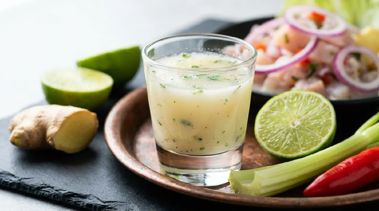 Leche de tigre (“tiger’s milk”) is the seasoned lime juice used to cure Peruvian ceviche. Modern versions blend raw fish into the liquid, giving it the characteristic milky, cloudy appearance. It is served as an aperitif in small glasses or used as the curing liquid for ceviche.
