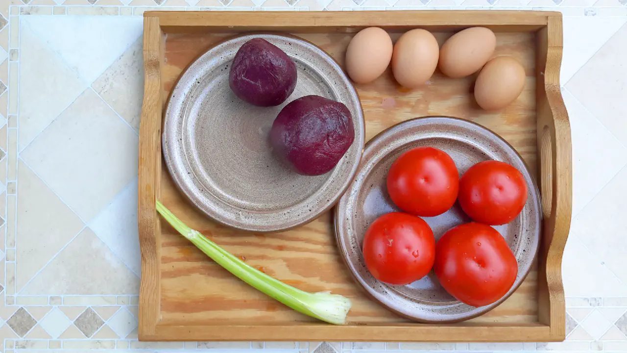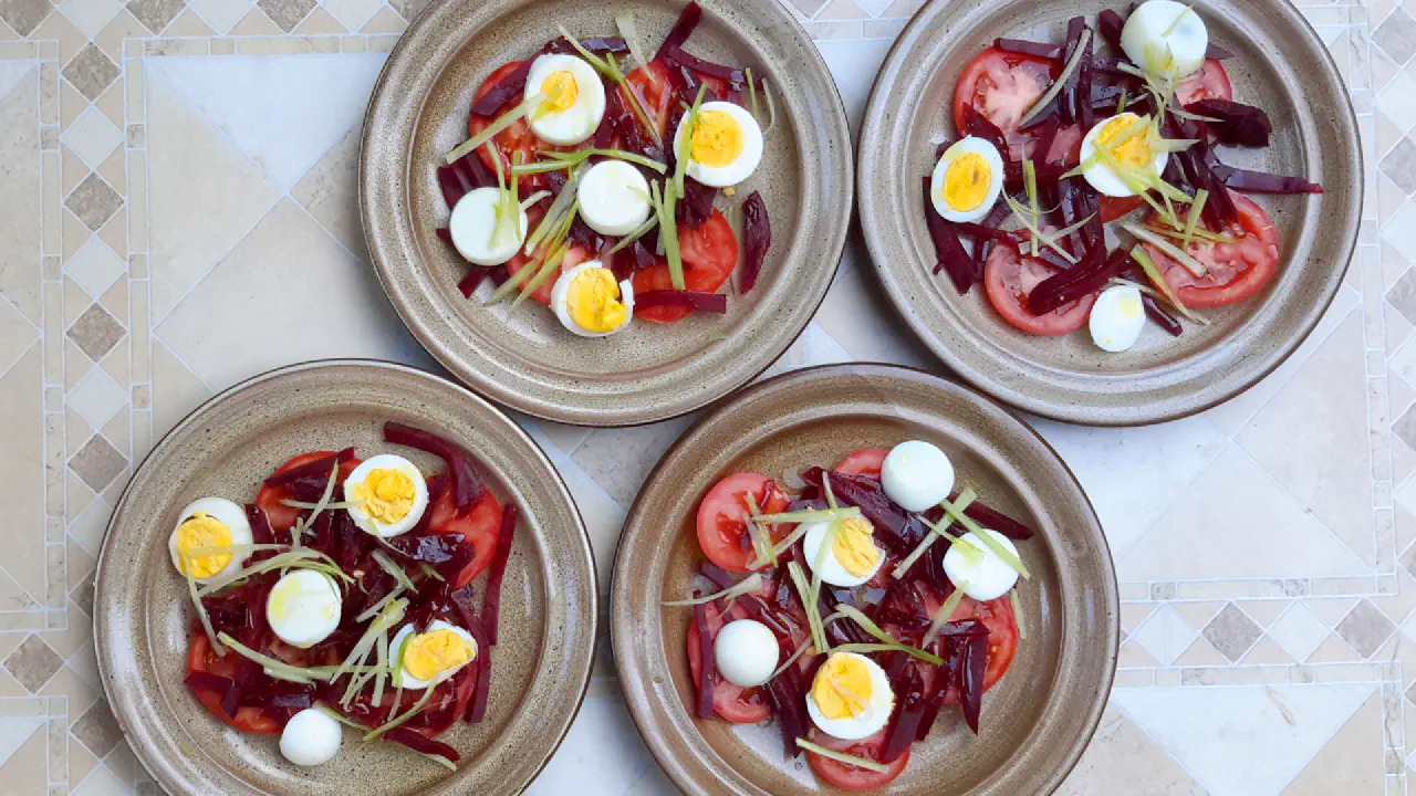 A simple, tasty and beautiful salad. Eggs and tomato is the perfect pairing. The beetroot adds the volume that satiates. Especially nice with a piece of good homebaked bread.