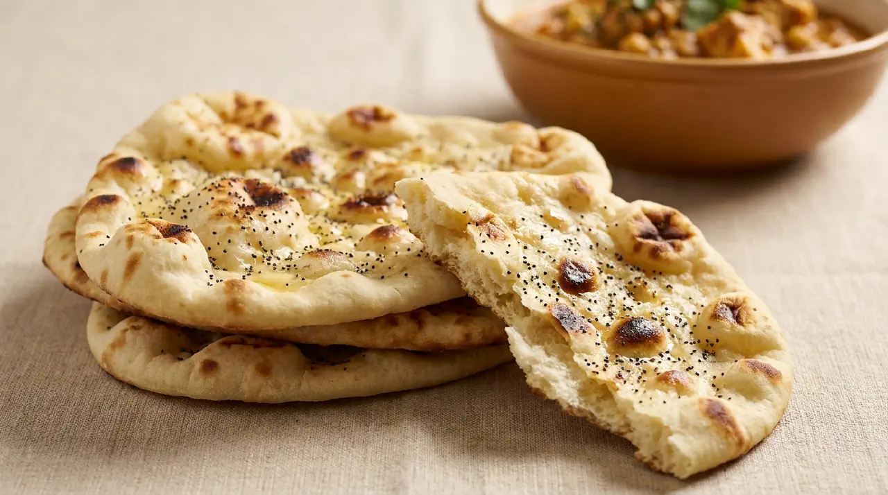 Naan is the soft, leavened Indian bread made with milk, yoghurt, and yeast. Unlike chapati, which is unleavened and dry, naan has an airy crumb and a buttered surface. The bread comes from the Persian-Indian Mughal kitchen and is traditionally baked in a tandoor, where the dough is pressed onto the hot clay wall and bakes in just a few minutes.