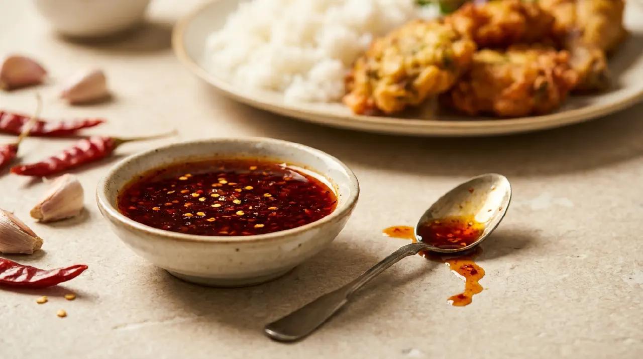 A Burmese tart-sweet chilli sauce made from dried red chillies, garlic, fish sauce, and rice vinegar. It is a pantry condiment, not made fresh per meal – blend it once and it keeps for weeks in the fridge. The sauce seems thin when first made but thickens as the chilli particles absorb liquid. Let it rest at least 24 hours before using.