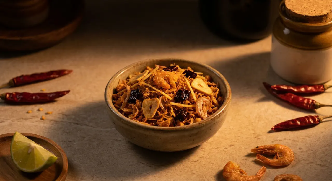 A Burmese fried condiment of dried shrimp floss, shrimp paste, shallots, garlic, and chilli. Each ingredient is fried separately for maximum crispness, then combined into a dry, shelf-stable relish. It is a fixture at Burmese almsgiving ceremonies and a common side with plain rice and raw vegetables.