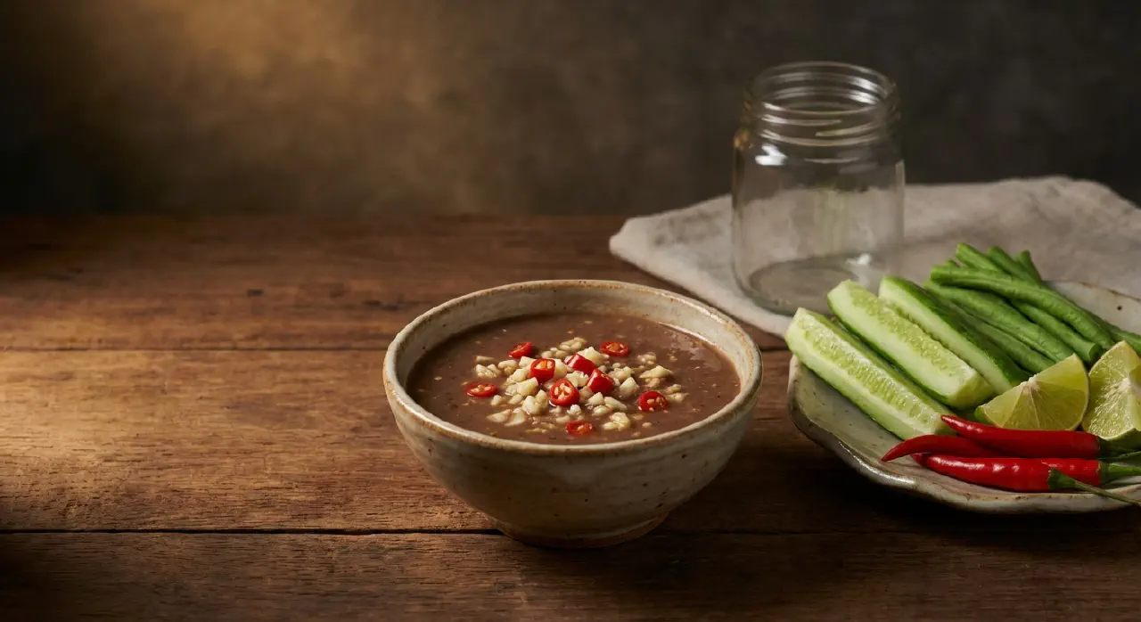 A thin, savoury dip of boiled fermented fish paste seasoned with garlic, chilli, and lime. This is the everyday table condiment of Lower Burma, served with a platter of raw and blanched vegetables alongside rice. In less affluent households it serves as both the main dish and the principal protein source.