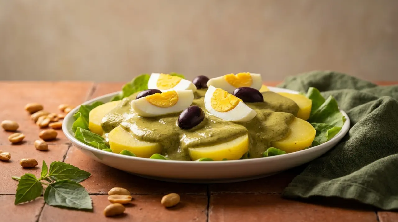 Ocopa is a Peruvian sauce from Arequipa, made from dried aji mirasol peppers, peanuts, fresh cheese, and huacatay (black mint). It is traditionally served as a composed dish: boiled potato slices on lettuce, covered with the sauce, and garnished with hard-boiled eggs, olives, and cheese.
