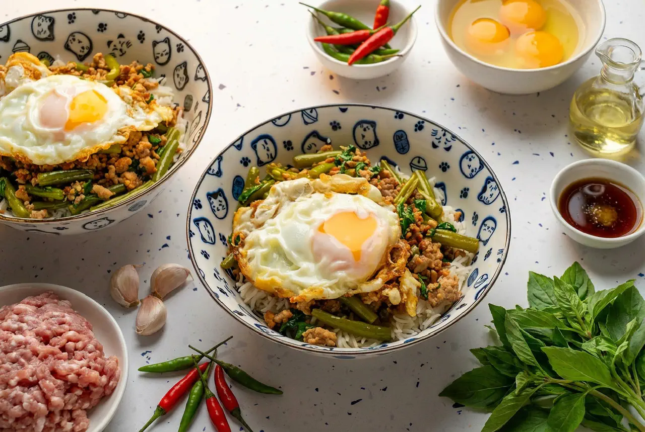 Pad Krapow is one of Thailand’s most beloved street food dishes - an intense stir-fry with holy basil, garlic, and chilies, served over jasmine rice with a fried egg with crispy, golden edges. The name says it all: “pad” means stir-fry and “krapao” is holy basil, the dish’s indispensable soul. You find it everywhere at street kitchens in Bangkok, made in minutes over a blazing flame, and it tastes exactly like what it is: fresh, peppery, bold, and satisfying.